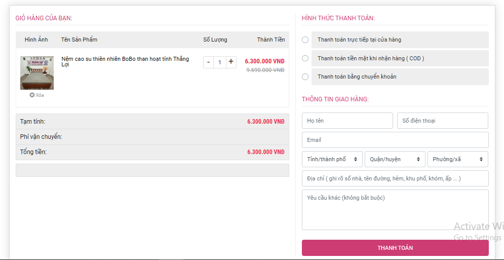 Quý khách vui lòng chọn hình thức thanh toán, sau đó nhập đầy đủ thông tin như hình bên dưới và bấm vào nút " THANH TOÁN ". Như vậy là đã đặt hàng thành công