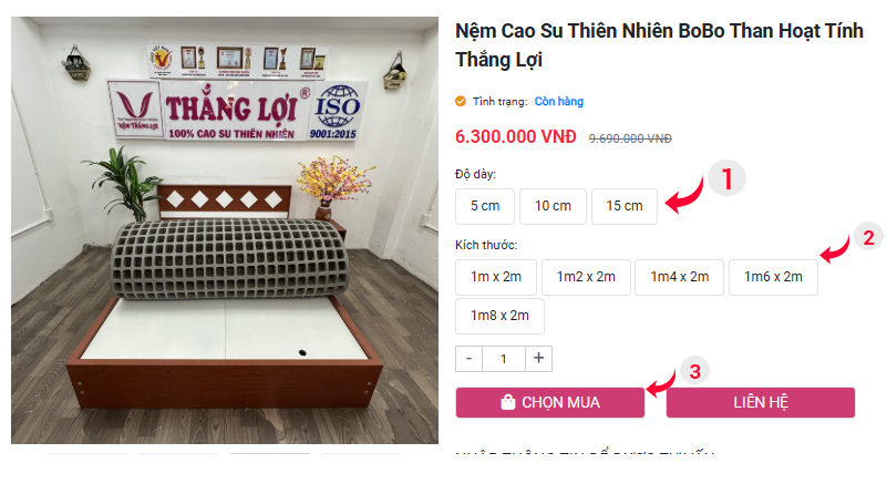 Bước 2: Chọn ĐỘ DÀY, KÍCH THƯỚC sản phẩm phù hợp và bấm vào " CHỌN MUA "